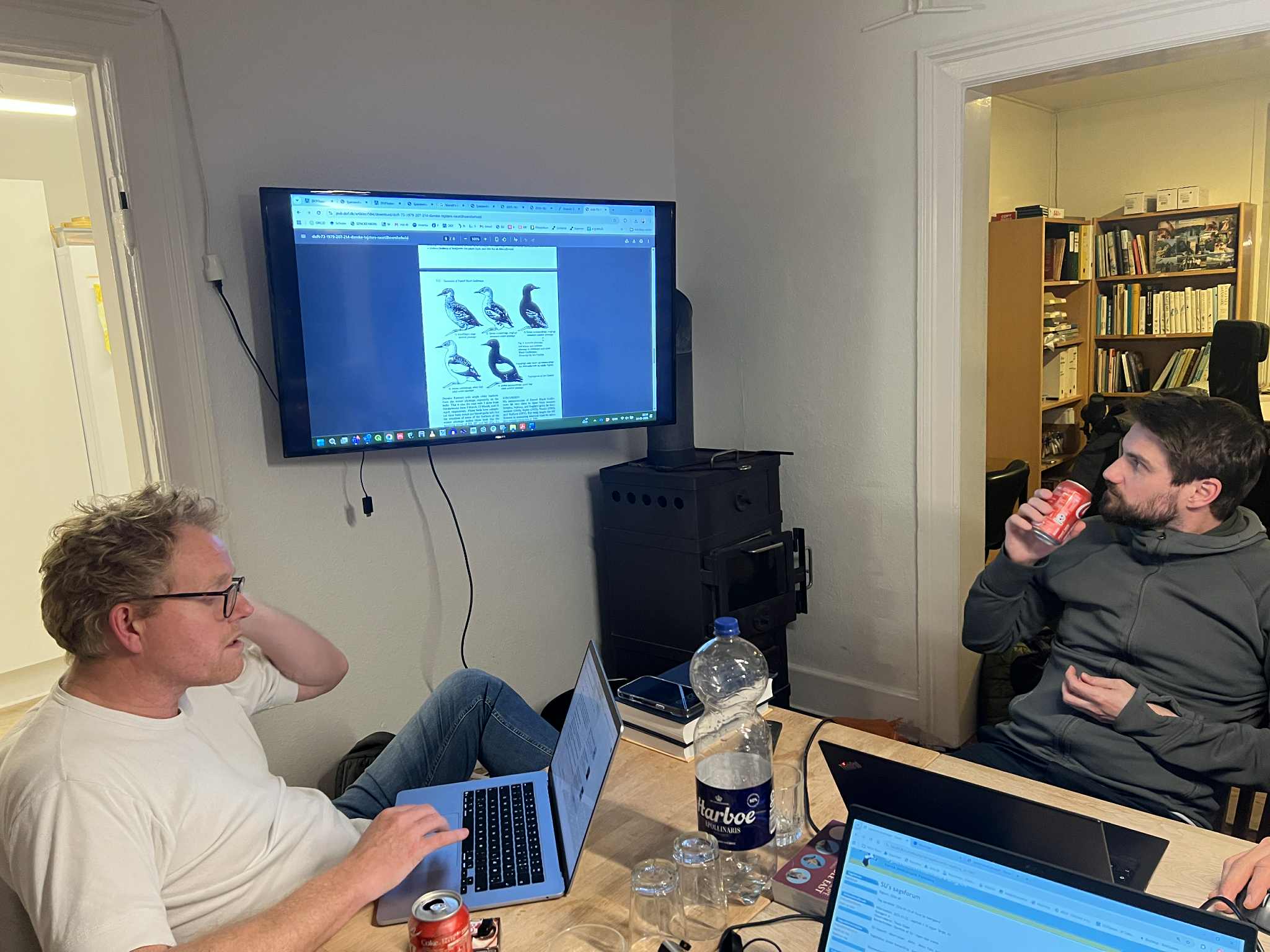 Gennemgang af identifikationskriterier for bestemmelse af Arktisk Tejst (ssp. mandtii). På billedet ses Sebastian Klein og Mikkel Willemoes . Foto: Rune Sø Neergaard. I bidende kulde afholdte Sjældenhedsudvalget den 24. januar 2026 møde på Blåvand...