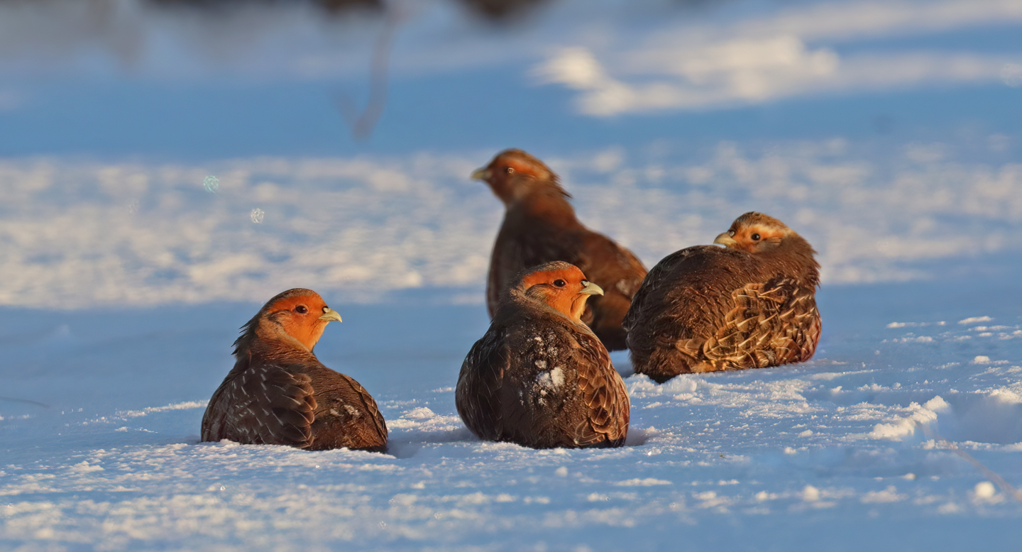 Titel: Agerhøne i sne og morgensol.