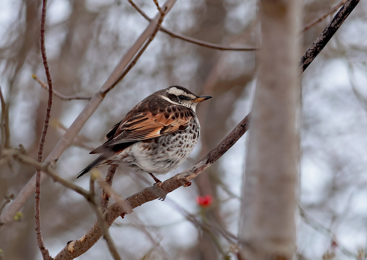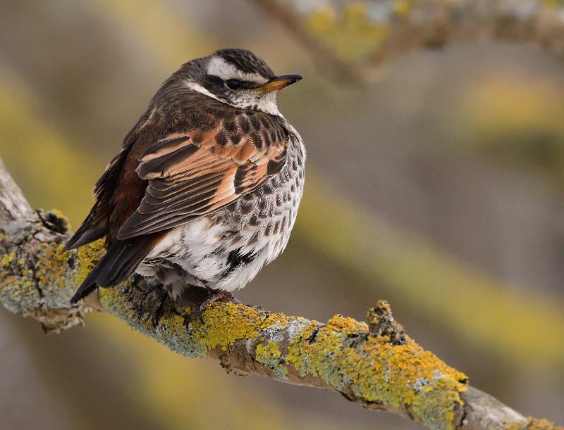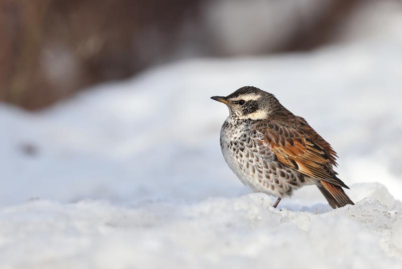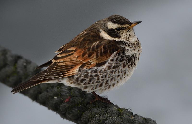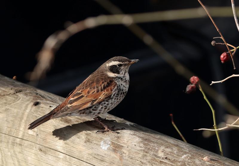 Beskrivelse: Her siddende på ræling langs med Krudtsløbsvej. Brundroslen er begyndt, at bevæge sig i mellem Nyholm og Krudtløbsvej i vinterkulden. Her følger den solsorte og søger efter områdets bærbuske.