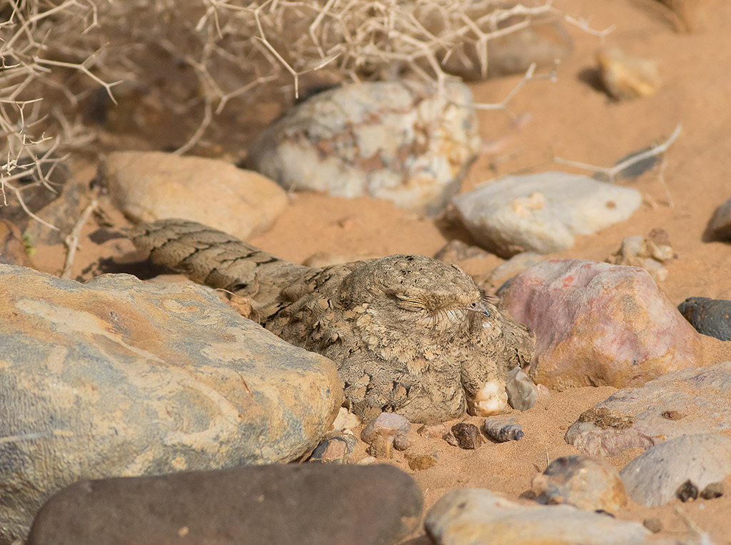 Beskrivelse: Uden guiden og hans kontakt til en berberfamilie ude i ørkenen havde vi nok aldrig set denne skønne fugl. Fantastisk at de kan finde dem sådan nærmest på bestilling.