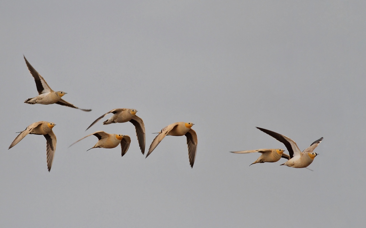 Beskrivelse: A mixed flock of Crowned and Spotted Sandgrouses.