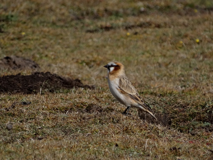 Beskrivelse: Langt mindre talrig end White-rumped Snowfinch (forholdet 1:50 i mit tilfælde) men som denne blev Rufous-necked Snowfinch også fundet i områder i og omkring kolonier af Pika, hvor de søgte føde på de kortgræssede områder og den opgravede jord.