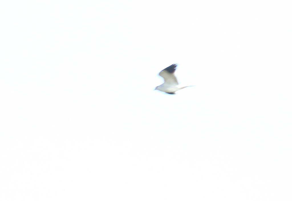 Beskrivelse: Kom indtrækkende fra Klinten nær radaren mod VNV kl.1200 langs bakkekammen nord for hovedstien i "traktorsporet". Sås kun i ca. 10 sek, fra den slap fri bag de høje bøge i øst til den forsvandt bag fyrreskoven i vest. Heldivis nåede jeg lige at tage de 2 vedhæftede, temmelig rystede fotos, før det var for sent. Der gik endda et par sek, før jeg i håndkikkerten så det sorte felt på overarmens dækfjer, og så fik jeg meget travlt med fotogrejet, som heldigvis hang lige parat på skulderen......
