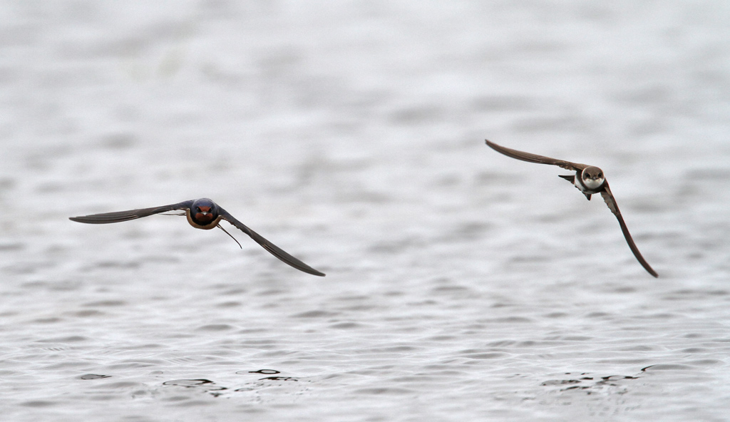Titel: Digesvale og Landsvale i flugt over vandet.