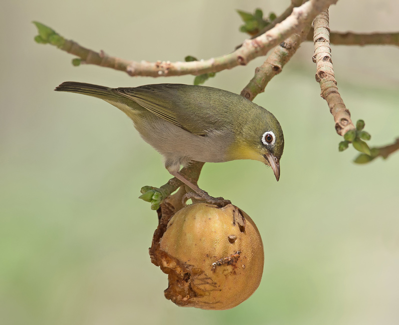 Beskrivelse: Også kaldet White-breasted White-Eye. Fouragerede 26.3 og helst i skyggen på i forvejen åbnede, modne figner - fik frugtkødet med de små kerner ud bl.a. via en lidt lang tunge.