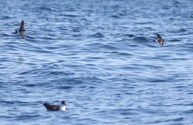 Beskrivelse: 2 Wilsons Stormsvaler med Storskråpe - begge arter repræsenterede til overflod på en 3 timers bådtur. Det var muligt at komme meget tæt på blandflokke af Stor- og Kuhls Skråper, men når endeligt stormsvalerne slog til måtte de komme i focus. Den dansende flugt med hængende ben og den kontrastrige overside gjorde wilsons lette at kende fra de talrigere Lille Stormsvale.