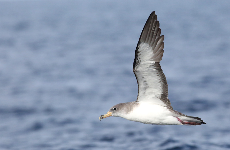 Beskrivelse: En sort håndflade, som det ses her, er et sikkert kendetegn for Atlantisk Skråpe, der nyligt er splittet fra Kuhls Skråpe (fra Middelhavet), der har hvidlig håndflade, og derfor kun smal sort indramning af vingespidsen.