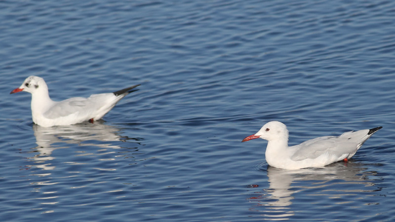 Beskrivelse: Bestemmelse af tyndnæbbet Måge fra hættemåge er ikke særligt svær. Faktisk er det kun vingetegningen, de to arter har til fælles. Tyndnæbbet Måge (t.h.) har højst ganske svag grå øreplet i hvidt hoved, lyse øjne og anderledes hovedprofil med længere næb, der normalt er ensfarvet, hvor den mørkøjede hættemåge har tofarvet næb.