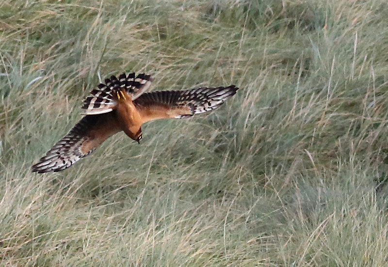 Beskrivelse: Denne prægtige unge hun af Steppehøg forgyldte morgenobsen ved Blåvand søndag 11.10 og blev for mange Felttræffets fedeste fugl. Den blev opdaget og udmeldt af Thomas Varto Nielsen fra Vejers Strand og trak ca. 20 minutter senere til rast foran undrende skare, der forekom stærkt tilfredsstillede, da fuglen efter et kort rast trak tæt forbi de fremmødte. Den var ret stor og "tung" af en steppehøg at være, og dét er hunner af denne art. Kønsbestemmelsen understøttedes af de helt mørke øjne.