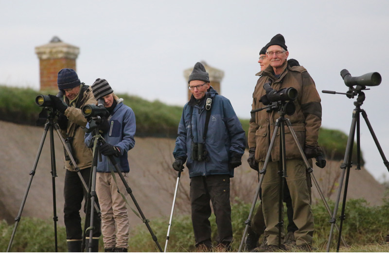 Beskrivelse: Gamle og unge samledes om fuglepassionen på felttræffet i 2015. Her ses fra venstre til højre Peter Hartoft-Jacobsen, Jonathan Hemmer-Hansen, Svend Pedersen, Hans Henrik Bay og Hans Katz under den arrangerede tur til Fanø. Så store træk, der undertiden rapportes fra øen, var vi dog overhovedet ikke vidne til, men ung som gammel kunne samles om at overskue det attraktive vødområde Hønen, dog uden observationer af de steppe- og måske-hybrid kærhøge, der i dagene inden var udmeldt fra området. At ung som gammel enes om fugleinteressen var Felttræffet som sædvanligt et smukt bevis på, og de unges dygtighed blev klart udstillet flere gange, bl.a. under sidste aftens gættefuglequiz. Det er et oplivende og positivt element, at ungdomslejren er blevet en så fast del af Felttræffet, og tak til arrangørerne for både det og selve træffet.