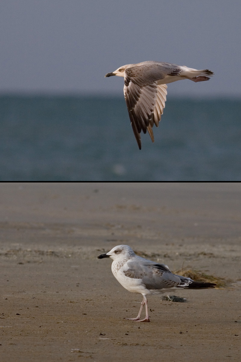 Beskrivelse: Kombinationen af overvejende sort næb, "sæbeøje" i mestendels hvidt hoved, grå ryg og overvejende grå dækfjer med kontrasterende velmarkerede sorte centre i de små dækfjer ses ofte hos 3K Middelhavssølvmåge.
