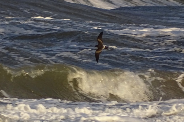 Beskrivelse: Efter solopgang sås denne Store Stormsvale komme trækkende langs brændingen. Den havde dog ikke tid til at fouragere modsat en fugl set inden denne fugl.