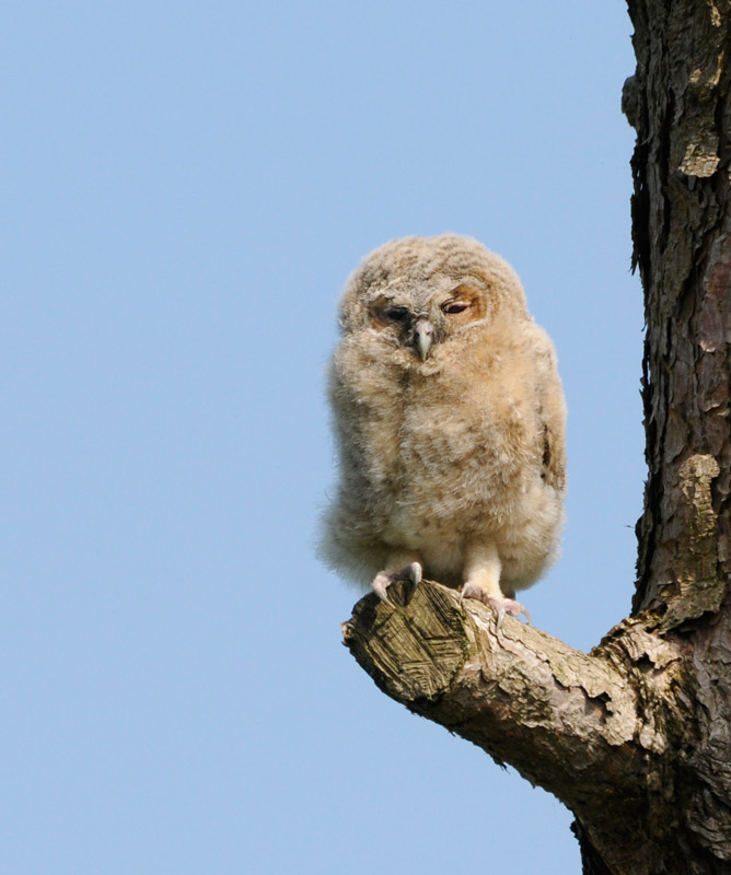 Titel: Natugle, lige fløjet fra reden. Vi så kun denne ene unge.