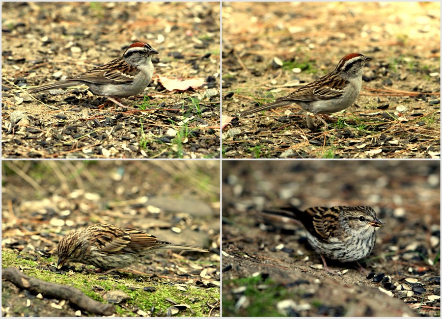 Beskrivelse: Below the feeder next door to the summer cottage there were Chipmonks and Chipping sparrow's - adult's in breeding plumage and juveniles