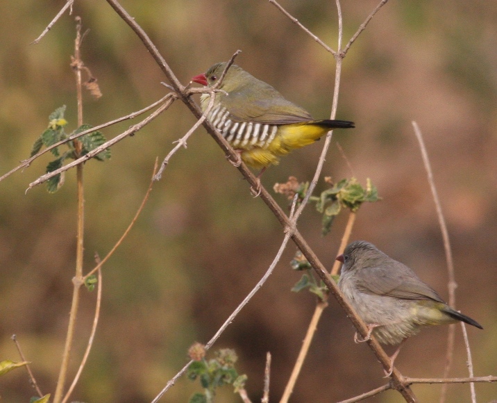 Beskrivelse: Green Avadavat er en endemisk art i Indien, og er nu blevet en lokal og sårbar art. Toppen af Mount Abu, som er en populær turist "hill station" i ørkenstaten Rajasthan, er et godt sted at se den. Vi fandt ret hurtigt to småflokke, som var nede at drikke ved vandløb ved noget krat, i landbymiljøet.