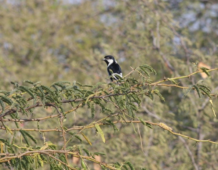 Beskrivelse: Den sjældne mejse White-naped Tit lever i akaciewadier i ørkenlandskab. Den regnes nu for "globally vulnerable" på grund af habitatforringelser. Vi fandt et par i en akaciebevoksning vest for byen Nakhatrana i delstaten Gujarat, Indien.
