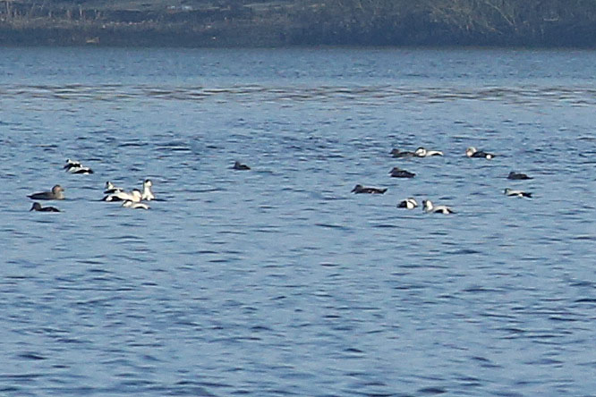 Beskrivelse: At finde en kongeederfugl han stor flok ederfugle er lidt som at finde rødhalset gås i bramgåseflokke. Det sort/hvide flimmer dækker over detaljerne, og alt efter, hvordan fuglen ses er det forskellige ting, man lægger mærke til. I modlys er det formen og det opsvulmede hoved med næbknolden (giver mindelser til knopsvane) samt ryggens "horn" der er tydeligst. I medlys kan det være den sorte ryg imod det lyse hoved (der mod lyst hav lan smelte sammen med vandet, hvis man ser fuglen bagfra), men hvis man får orange og røde næbfarver ind er det direkte påfaldende i en gruppe af de almindelige ederfugle, der mangler disse "modne frugtfarver". Den mindre størrelse kan være påfaldende, men ikke så meget på den aktuelle han ved Svendborg.