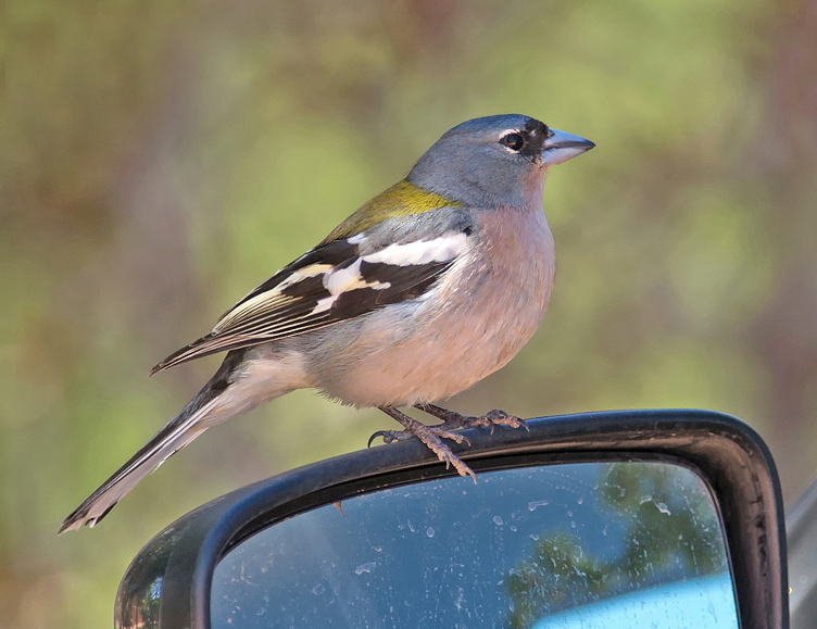 Beskrivelse: Den afrikanske Bogfinke fouragerede desværre langt oftest i skyggen, men er her taget på sidespejlet, hvor den ihærdigt bekæmpede fjenden.