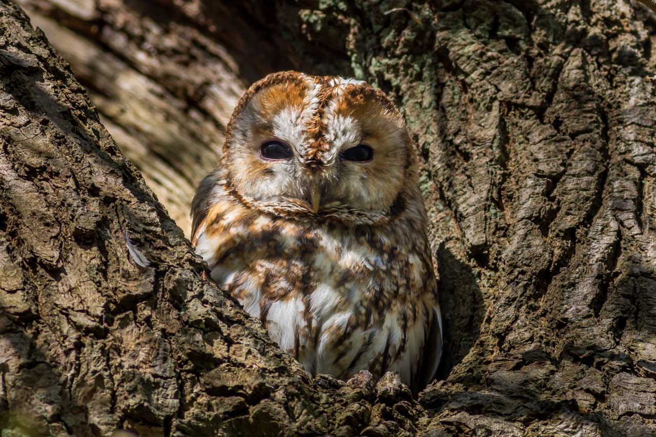 Beskrivelse: Denne Natugle sad i træ få meter fra ridestien mellem Fortunen og Erimitageslottet, med front mod stien. Jeg havde ikke set den, men stillet min cykel op ad træet under hullet, og sat mig om på den anden side for at se ind i skoven. Efter en time råber forbi-riddende piger, at der sidder en ugle!