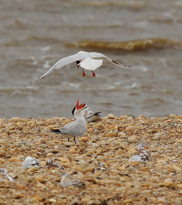 Beskrivelse: Rovternen havde længe stået og hvilet med hovedet under en vinge...vejret var blæsende og med regn. En lille flok hættemåger gik pludselig i gang med at moppe ternen, men den blev hvor den var! Kort efter stoppede mobningen igen, og rovternen hvilede roligt videre på sin plads.
