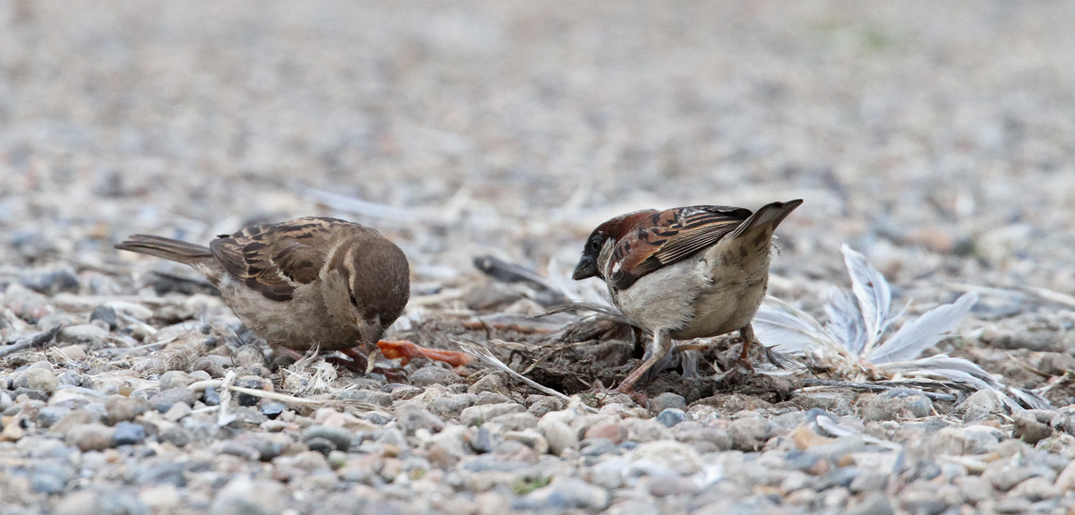 Beskrivelse: I Havterne kolonien på havnen har nogle Gråspurve specialiseret sig i at finde Maddiker, ved at løfte op i overkørte Havterneunger, og tage Maddikerne når de falder nedenud.