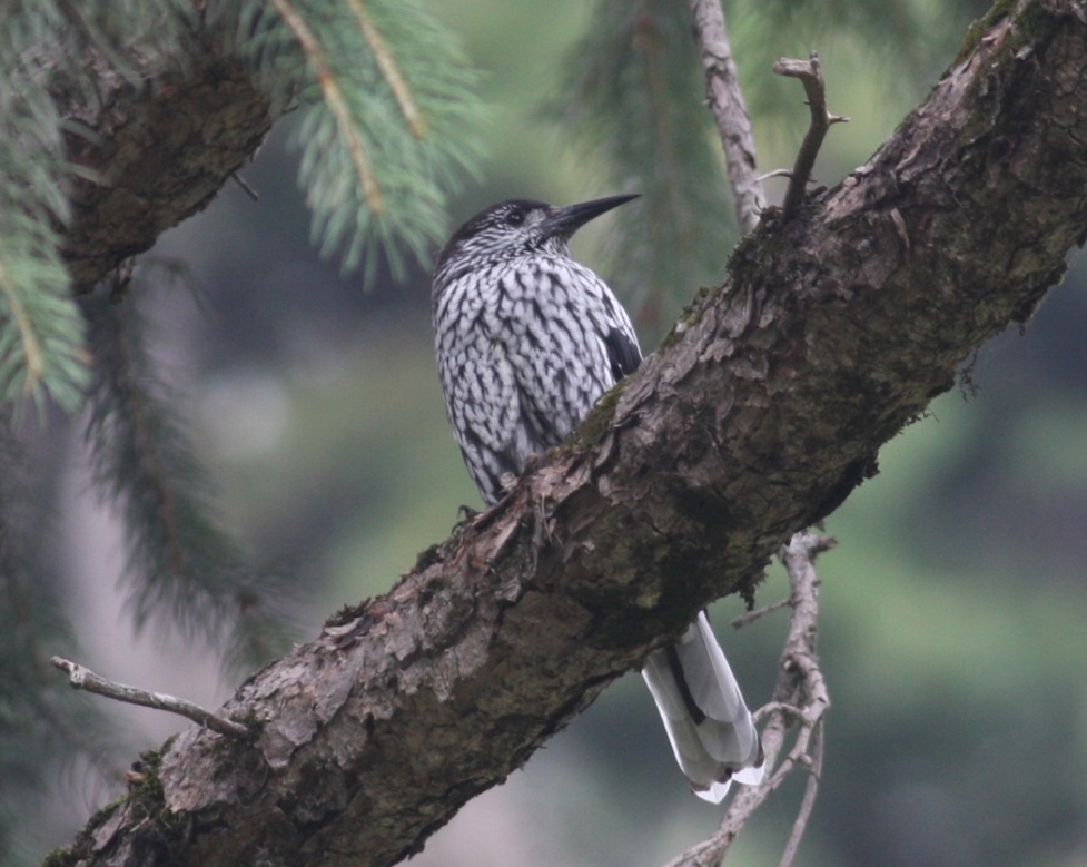 Beskrivelse: En fåtallig art i Kashmirs fyrreskove. De store, lyse pletter på kroppen flyder næsten sammen, og får fuglen til at virke meget lys på afstand, næsten som en Clark's Nutcracker. Bemærk også det meget spidse, tynde næb, selv i forhold til den europæiske tyndnæbbede nøddekrige. Kaldet er et staccato kra-kra -kra, næsten krageagtig, og forskellig fra vores nøddekriges rullende kald.