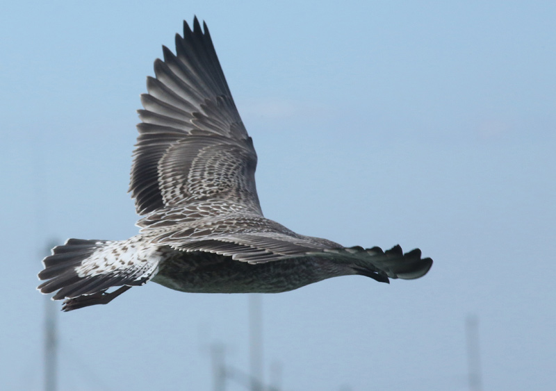 Beskrivelse: Ung Sildemåge i flugten er meget kontrastrig: overgump og halerod lyser hvidt op imod bredt sort halebånd og vingerne er mørkebrune. De kan virke næsten ensartet mørke i felten, men her ser man en let tendens til lyst "vindue" i de inderste håndsvingfjer, der dannes af lysere inderfaner på disse fjer. De langt mere udbredte lyse felter hos Sølvmåge skaber disses artstypiske lyse "vindue" i inderste håndsvingfjer. måge-fundamentalister kan gå år med at diskutere hvor kraftige disse felter kan være hos Sildemåge, men her er de dokumenteret i et splitsekund.