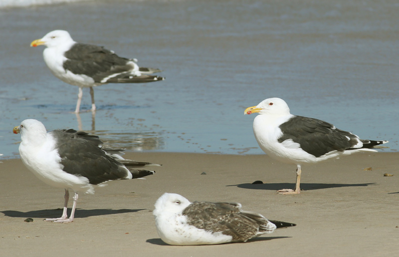 Beskrivelse: Mågearter, der som adulte har lyserøde ben, kan - især først i yngletiden - få gultonede ben. Fuglen til højre har en mat gul farve på i det mindste det ene ben, men farven er langt mindre intensiv end hos Sildemåge, der ville have forekommet langt mindre med slankere sort vingespids uden Svartbagens brede hvde spids på yderste håndsvingfjer. Svartbag ser desuden brutal ud med stort, i spidsen opsvulmet næb og flad pande samt øjnene typisk anbragt længere bagtil i hovedet.