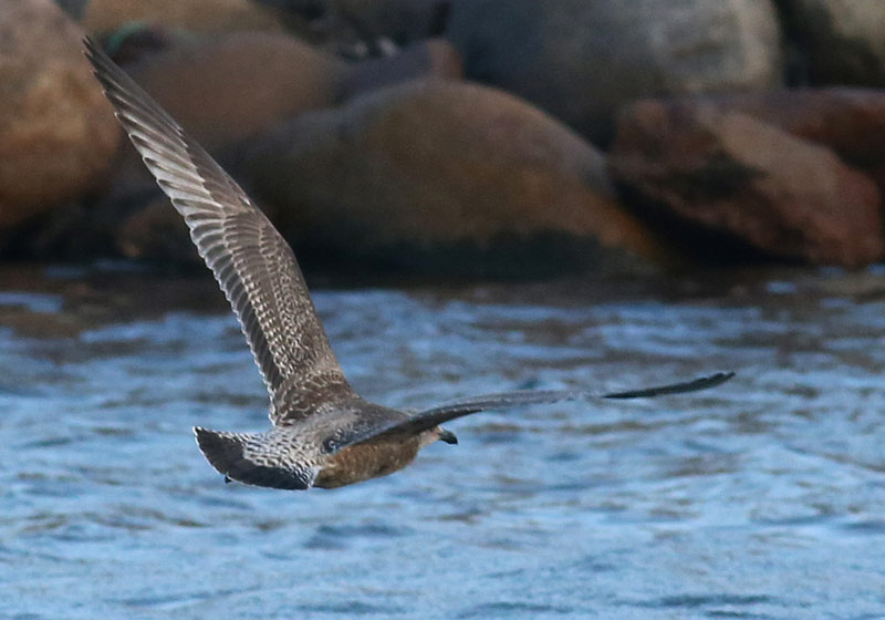 Beskrivelse: Denne mørke Sølvmåge er identisk med den, der er uploaded fra Skagen 30.8 2016 - en meget mørk ungfugl. Selv hos mørke Slvmåger er det lyse "vindue" inderst i hånden normalt fremtrædende, men kan også genfindes hos lige så mørke Amerikansk Sølvmåge. Denne fugl ligner Amerikansk Sølvmåge, men har for smalle og generelt for distinkte mørke tværbånd på overhaledækfjerene. Amerikansk Sølvmåpge har generelt mere udvandede og bredere mrke markeringer, der i felten synes at flyde sammen med ryggens farve. Desuden har haleroden lidt for meget hvidt, ligesom hvide spidser på halefjerene passer bedre på Sølvmåge.