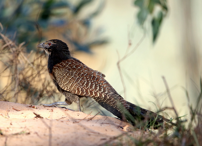 Beskrivelse: Quietly walking around on the overgrown riverbanks of Katherine River. Not shy - but difficult to get a 'clean' shot at, since the bird is rather big and the plants often cover parts of the bird.