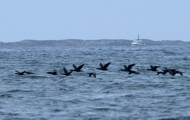 Beskrivelse: Blandet flok, hvor topskarvernes mindre størrelse, tyndere hals og hoved (Toppet skalleslugeragtig sammenlignet med Skarvs Store skalleslugeragtig) samt tykkere mave ses mellem de større, kraftigere skarver.