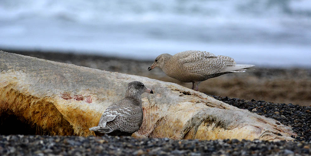 Titel: Gråmåge og Hvidvinget Måge på hvalkadaver