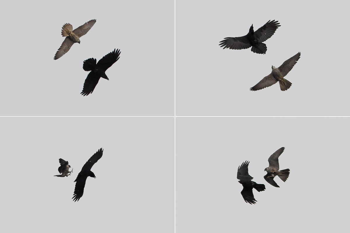 Beskrivelse: Om Vandrefalken virkelig var på jagt står hen i det uvisse. Indimellem så det ud, som om de legede i den kraftige blæst, men generelt var det Vandrefalk efter Ravn. På billedet ses det tydeligt, at Vandrefalken har kløerne fremme, men jeg så aldrig nogen direkte kontakt mellem fuglene (i hvert fald ingen løse fjer efter slag fra Vandrefalken). Legen/jagten stod på i ca. 10 min. Desværre et par hundrede meter fra, hvor jeg stod, så billedkvaliteten er derefter.