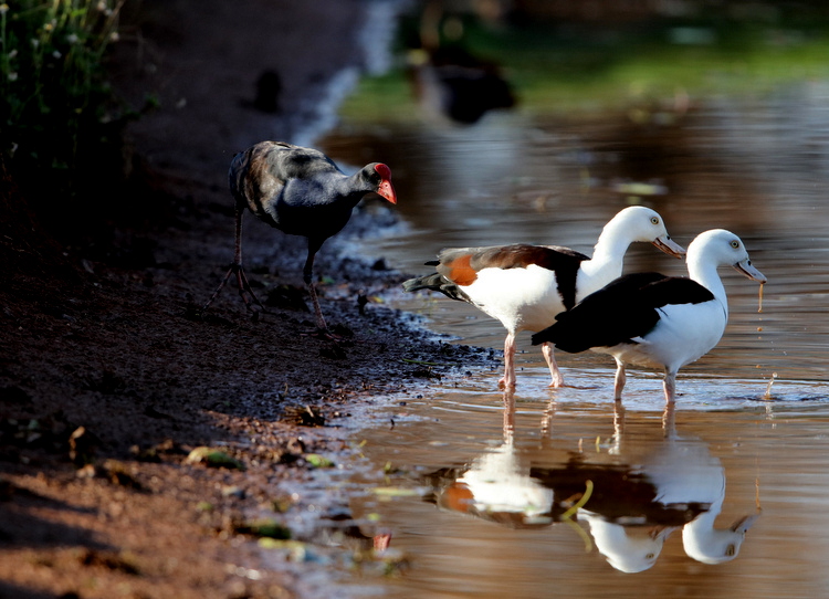 Beskrivelse: Female in front, male behind (size of breast-band). Pretty common in NW Australia - from Lake Kununurra to Darwin. Seen every day within the city limit of Darwin. Also on the picture: Purple Swamphen, P. Porphyrio