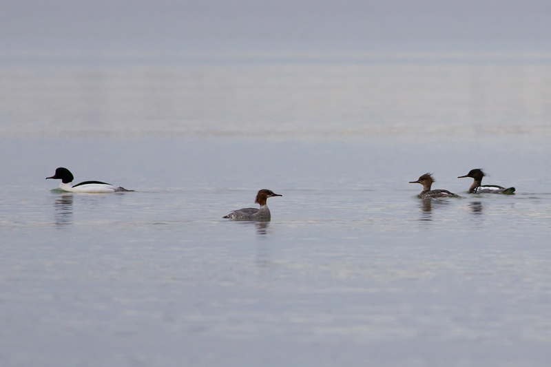 Beskrivelse: Fra venstre mod højre: Adult han Stor Skallesluger, Adult hun Stor Skallesluger, Adult hun Toppet Skallesluger og til sidst Adult han Toppet Skallesluger yderst til højre.