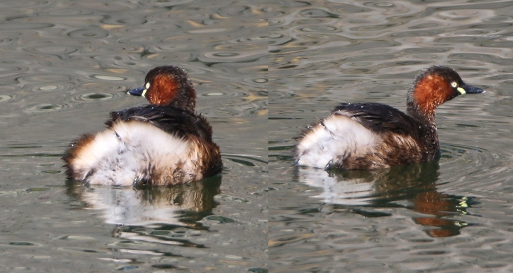 Beskrivelse: To fotos af samme fugl. Sommerdragt i januar og med hvide/hvidlige øjne...