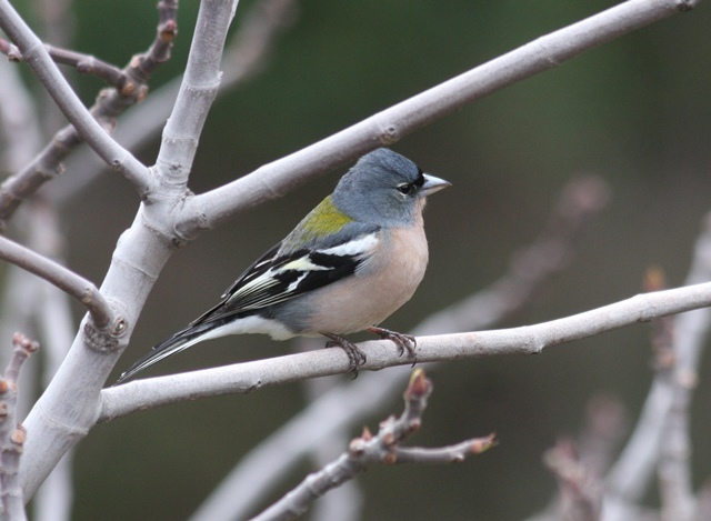 Beskrivelse: Den flotte, nodvestafrikanske race af bogfinke Fringilla coelebs africana har grøn ryg og helt blåt hoved.