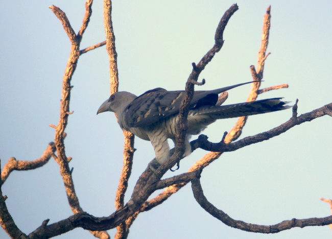 Beskrivelse: Early morning and a trumpet-sound outside the camper - high in the tree-top this strange over-size cuckoo (70cm!). The humid air caused my lens to catch the dew instantly... and the bird was only there for seconds. Brilliant wake-up !