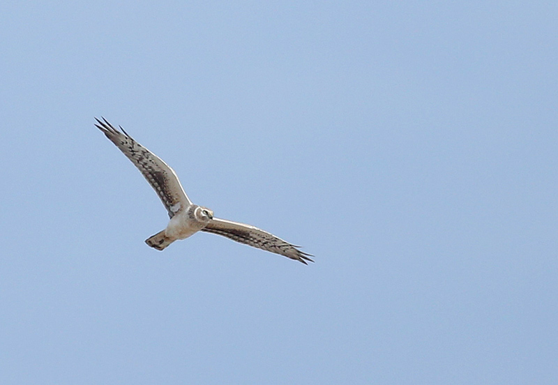 Beskrivelse: Afbleget 2K han Steppehøg. Den meget lyse bug er beigetonet, og i kontrast til en ny, hvidlig armhulefjer. Bemærk den unge hans lyse bånd gennem armsvingfjerene, ret svage hovedtegninger og som nævnt - lys kropsunderside.
