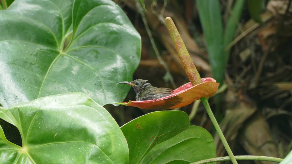 Beskrivelse: Hun. Tager bad i duggen, som har samlet sig i det skålformede blad.