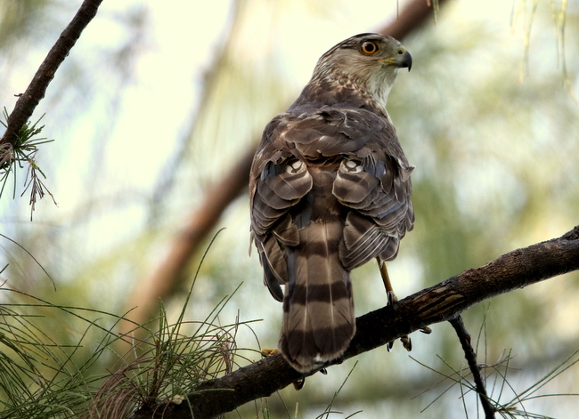 Beskrivelse: sub-adult bird, view from behind: note size, long rounded tail and yellowish eye
