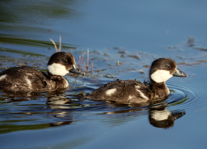 Beskrivelse: in the pond: a female and 7 ducklings. These two have just been diving, - and still some plant material remains