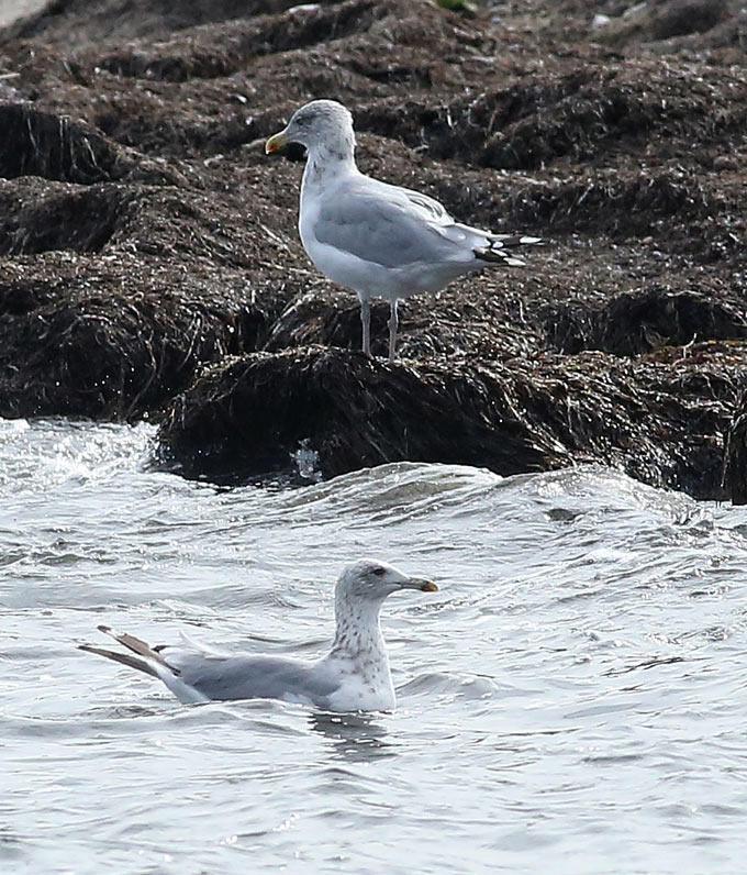 Beskrivelse: Formodet hybrid (nederst) med Sølvmåge. Fuglen havde et særegent jizz: lille hoved, slankt næb, lang hals og slank krop. Den havde mørke øjne i begge sider, og næbbet manglede Sølvmåges velmarkerede gonysvinkel. Den lignede jizmæssigt mest Kaspisk måge, men næbbet syntes for kraftigt, og hvad der afveg helt fra Kaspisk var den grove sølvmågetegning på hoved og halssider; her ville en Kaspisk være hvid. Fuglen havde altså underlige blandkarakterer mellem de to arter, og kan derfor mistænkes som hybrid. 100% sikker kan man dog aldrig være.