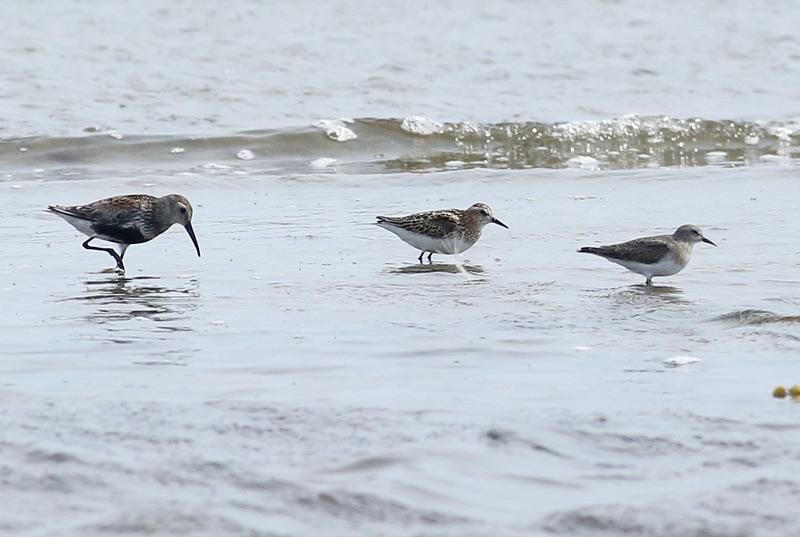 Beskrivelse: De to småryler, der er regelmæssige herhjemme, ligger i hver sin ende af "sværhedsskalaen" omkring de små ryler. Længst til højre ses Temmincksrylen - en juvenil med meget smalle lyse rande på oversidefjerene; så smalle, så vingen ser ensartet ud på afstand og af samme farve som den utegnede grå ryg. Det mørke bryst og den langstrakte form (den mest langstrakte blandt smårylerne) giver mindelser til Mudderklire, men i miniature. Dværgrylen midt i billedet - en adult - har langt mere spraglet overside med mørkcentrede, lysrandede fjer, og har desuden langt mere kontrastrige hovedtegninger (hvilket jo ikke er så svært i forhold til Temmincksryle, hvis hoved synes temmeligt ensartet), hvor man bemærker lys pande og øjenbryn. Dværgrylen er en adult med næsten komplet mørkstribet bryst, som det ses ved slid hos arten, hvor brystets lyse fjerrande er næsten afslidte. De længere ben og det kortere bagparti hos Dværgryle og den generelt større størrelse ses også. Sammenlign størrelsen med den Almindelig Ryle.