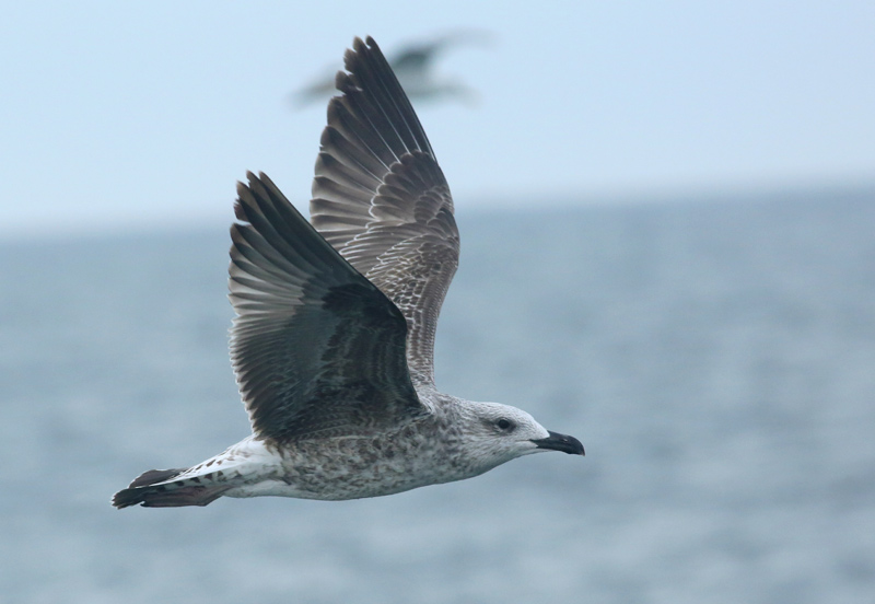 Beskrivelse: Typisk 1K efterår med hvidt hoved og mrk maske om jet, kraftigt sort næb og mørke vinger, uden Sølvmåges lyse indre håndsvingfjer, samt mere intenst brunfarvet end Sølvmåges "leverpostejsfarvede" dragt.