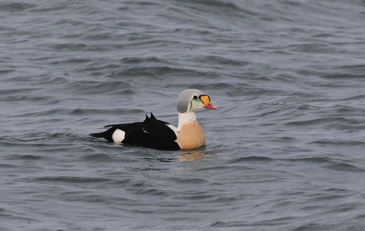 Beskrivelse: Denne adulte han Kongeederfugl har siden 28/12 2017 forgyldt Hirtshals, hvor den det meste af tiden har ligget i en flok Ederfugle nedenfor 'Leret' og Husmoderstranden. Til tider ligger den ganske tæt på stranden og har været et stort tilløbsstykke omkring Nytår. I starten havde den en del mørke pletter på det rosa bryst, der formentlig er rester af eclipsedragten. De fleste pletter er nu fældet bort, og fuglen er i næsten fuld pragtdragt.