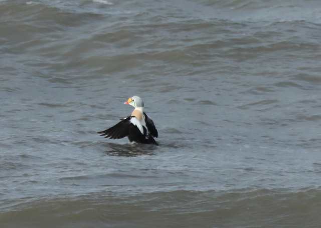 Beskrivelse: Kongeederfugl i havet nedenfor fyret i Hirtshals