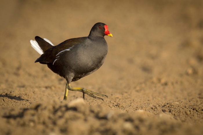 Beskrivelse: En lille flok grønbenede rørhøner fouragere ved brinken langs åen nær havnen. Et par af dem gik også hen over vejen hvor de fandt lidt frø/korn.