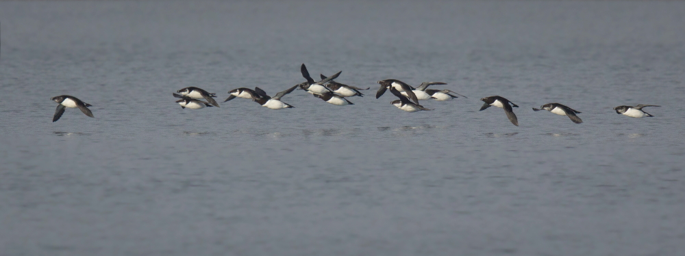 Beskrivelse: En flok på 16 ud af et større antal alke som raster og fourager i området omkring den gamle Lillebæltsbro.