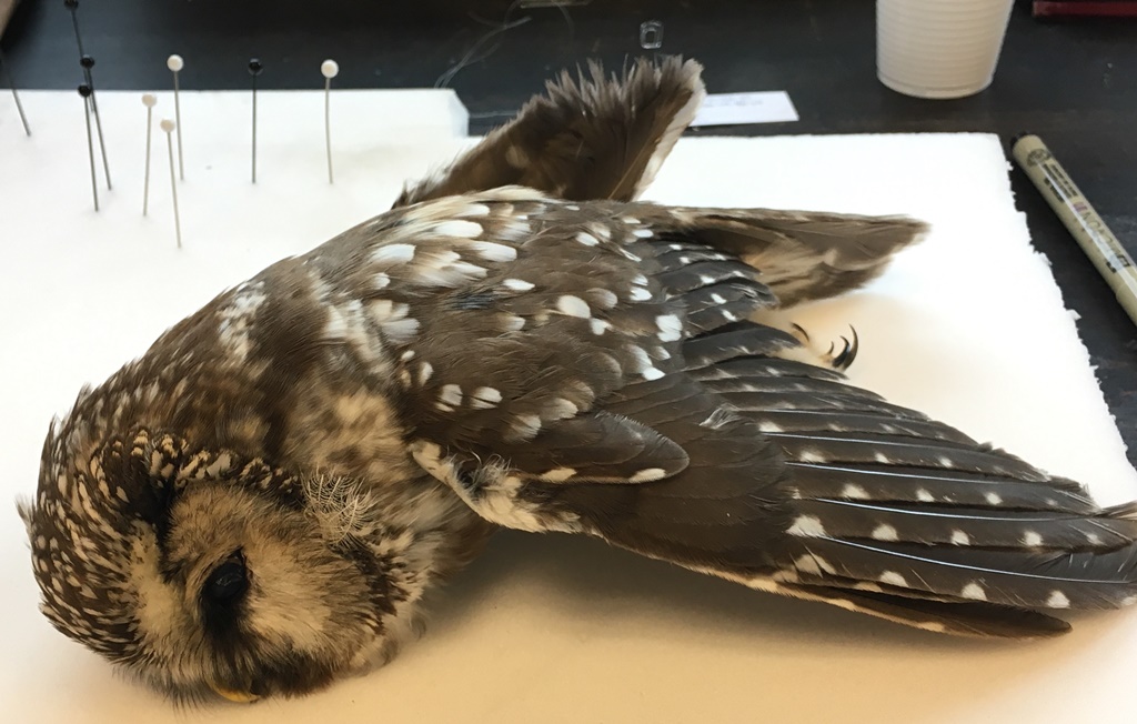 Beskrivelse: Perleugle fløjet mod rude og afleveret til plejestation. D. 16. marts 2018 afleveres fuglen så til Statens Naturhistoriske Museum. Den er nu skindlagtog indgår i museets samlinger. Det er en 1K hun